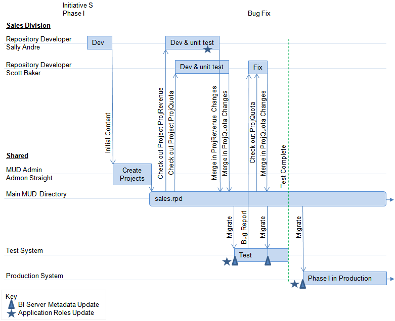 In the first phase, both Sally Andre and Scott Baker will develop in parallel. Sally will create the starter content, which Adam Straight will divide into projects. He will then create the MUD directory so that Sally and Scott can check out and perform their development. After unit testing, they merge and publish their changes, and then Adam migrates the repository to the test environment. After a bug fix cycle, Adam promotes the repository to production.