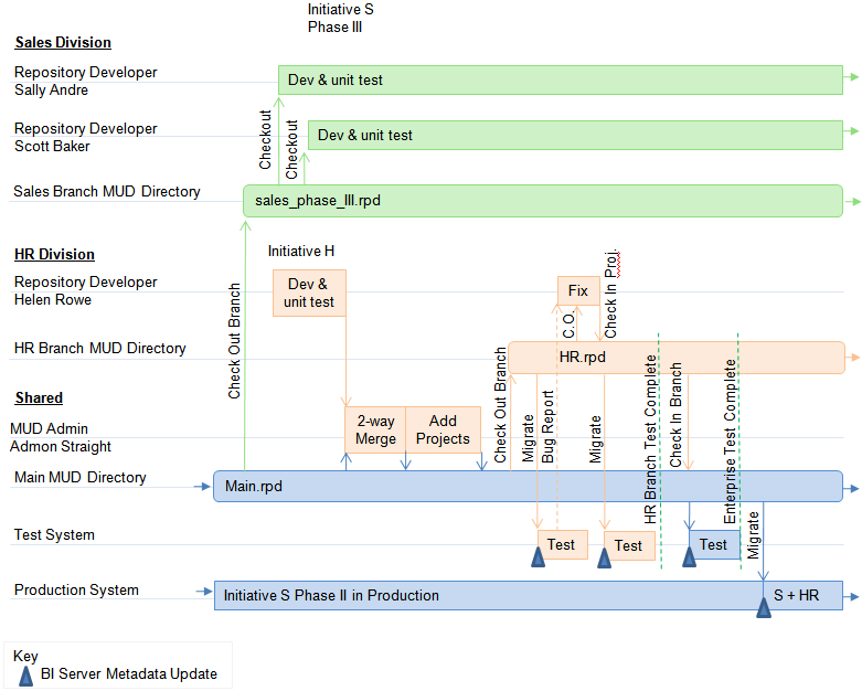 Initiative S: The Sales Division wants to use Oracle Business Intelligence for dashboarding and analysis of revenue versus plan. They want to deploy an initial phase to production quickly to meet an immediate need. Then, they want to roll out more functionality in Phases II and III. Initiative S is large enough that they will have two developers working on it.