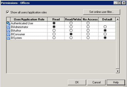 In the Permissions dialog, any users or application roles with the Default permission do not appear in the User/Application Roles list. Select Show all users/application roles to see users and application roles with the Default permission.