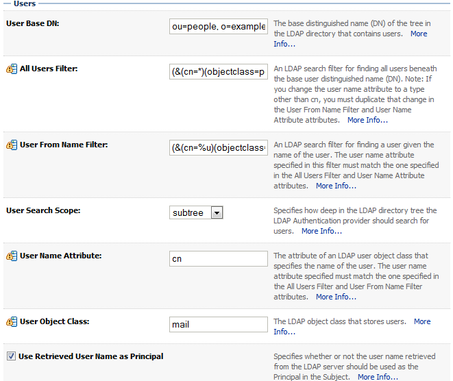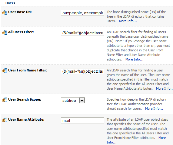 | Users | User From Name Filter | The LDAP search filter. Click More Info... for details. |