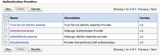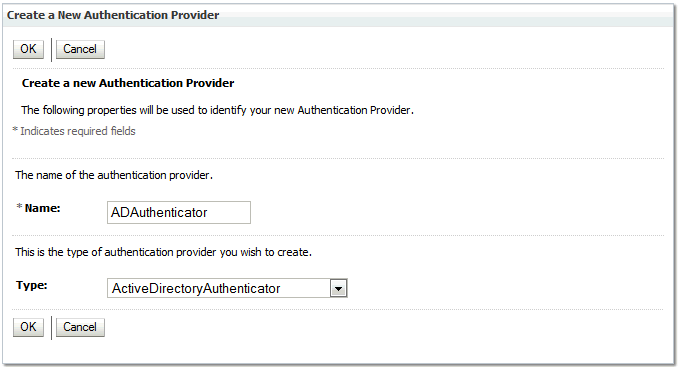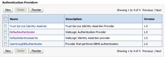 For more information about configuring authentication providers in Oracle WebLogic Server, see Oracle Fusion Middleware Securing Oracle WebLogic Server.