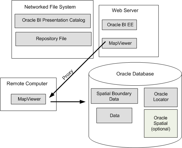 Co-located MapViewer — Also known as nonproxy mode. If the MapViewer is located in the same domain as Oracle BI EE and used as the rendering engine, then all map resources (such as JavaScript files and images) are downloaded from that instance of MapViewer.