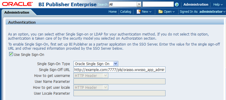 To set up Oracle Single Sign-On, first configure WebLogic Server using the instructions in the chapter, "Configuring Single Sign-On in Oracle Fusion Middleware" in Oracle Fusion Middleware Application Security Guide. BI Publisher must be configured to use Oracle Internet Directory as the default LDAP server.