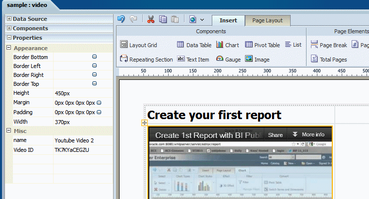 This example creates a plug-in to enable users to embed YouTube videos in a BI Publisher report. When viewed as interactive output, the user can view the YouTube video using the embedded controls.