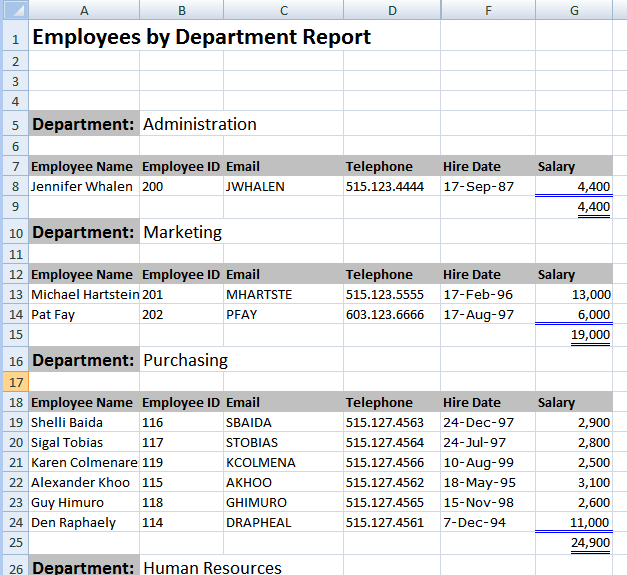 This example demonstrates how to use an XSLT preprocess file to group the sample XML data by the count of occurrences of /ROWSET/ROW and then configure the Excel template to create a new sheet for each occurrence of the newly created group.