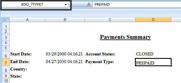 When you insert a field, the Template Builder creates a mapping between the data and the cell by assigning a unique Excel defined name to the cell and mapping the data element to that defined name. The mapping is written to the XDO_METADATA sheet as shown in Figure 6-6.