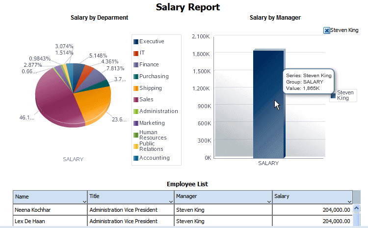 BI Publisher Layout Templates are created using the BI Publisher Layout Editor - a design tool that provides a WYSIWIG, drag and drop interface for creating pixel perfect reports in PDF, RTF, Excel, Word, PowerPoint, and HTML. It also provides dynamic HTML output that supports lightweight interaction through a browser. This interactive output is featured in Figure 3-1.