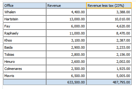 Figure 3-100 A Table Showing the Custom Function Revenue less tax (23%)