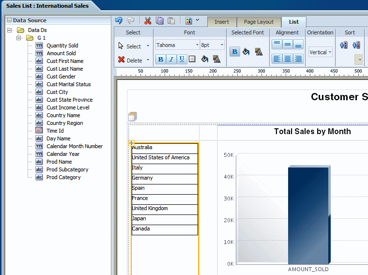 The list component displays all values of a data element in a vertical or horizontal list. When viewed in interactive mode, clicking an item in the list updates the results shown in the linked components of the report. Figure 3-78 shows a report that displays multiple charts based on sales data. The list component displays each country for which there is sales data. The list enables the report consumer to quickly see results for each country in the list by clicking the entry in the list.