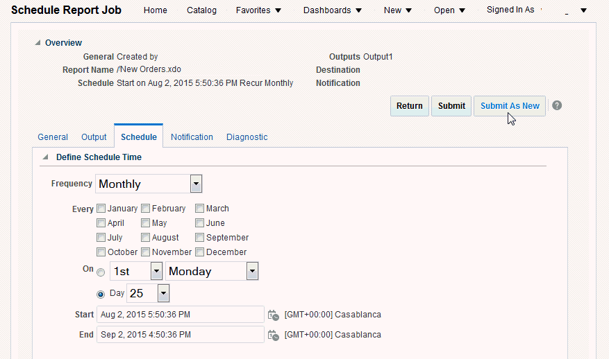 To monitor a running job or to see the results, navigate to Report Job History page as follows: On the global header, click Open and then click Report Job History. For more information, see Section 6.1, "Viewing Report Job History and Saved Output."