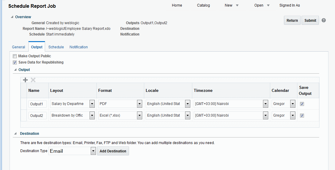 Delivery servers are set up in the Administration page. For more information, see "Setting Up Delivery Destinations" in Oracle Fusion Middleware Administrator's Guide for Oracle Business Intelligence Publisher.If you do not require a destination, leave this region blank. Select Save Output to view the output from the Report Job History page. For more information, see Section 6.1, "Viewing Report Job History and Saved Output."