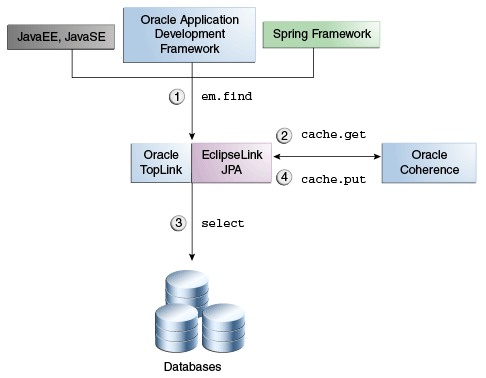 In this traditional Coherence approach, TopLink Grid provides the CacheLoader and CacheStore implementations in the oracle.eclipselink.coherence.standalone package that are optimized for EclipseLink JPA. This technique is described in "Using TopLink Grid with Coherence Client Applications".