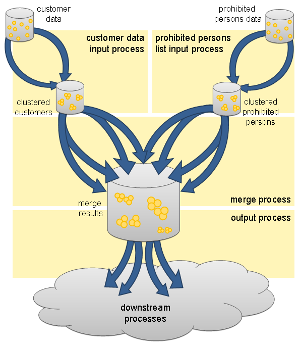 | Comparison phase | The customer data and prohibited people data is retrieved, ordered by cluster values. The data is gathered into groups of equal cluster values, queued and passed to the match process threads to compare the records. Where relationships are found between records the relationship information is written to the Results schema. |