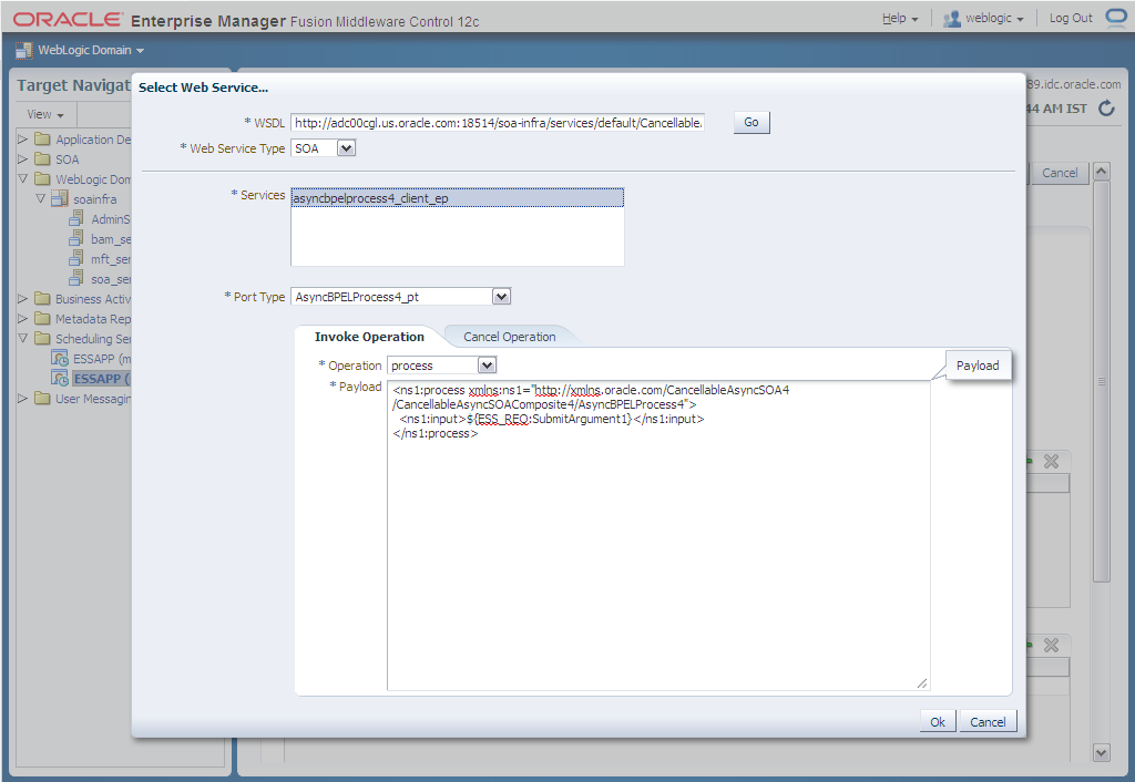 The job definition can have user defined parameters. Elements or attributes in the invoke or cancel payload XML code can specify that one of these parameters be plugged in as the element value by specifying a token substitution instruction. For example, plug in the parameter customerID with the token substitution command ${ESS_REQ:customerID}. This allows the job submitter to just enter parameter values and have the XML payload constructed from them. Token substitutions can also be specified for the WSDL base URL and WSDL relative URL system properties. For more information about token substitution see Using Tokens and Logical Clusters .