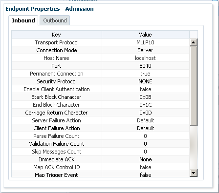 The Endpoints table displays a list of all endpoints in the Oracle Healthcare system along with the status, transport protocols, message counts, and queue counts associated with each of the endpoints. You can perform the following actions in this table: