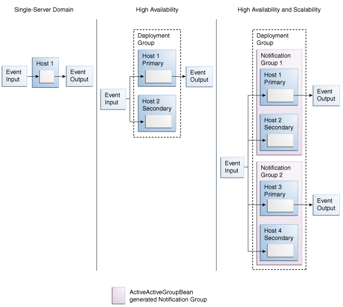 Figure 17-6 shows three Oracle Stream Analytics application scenarios progressing from the simplest configuration, to high availability, and then to both high availability and scalability.