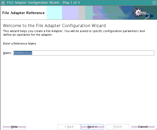 When you select an adapter type (for this example, File was selected in Figure 4-24), the dialog shown in Figure 4-25 prompts you to enter a name. When the wizard completes, a WSDL file by this name appears in the Applications window under the WSDLs folder. The service name must be unique within the project. This file includes the adapter configuration settings you specify with this wizard. Other configuration files (such as header files and files specific to the adapter) are also created and display in the Applications window.