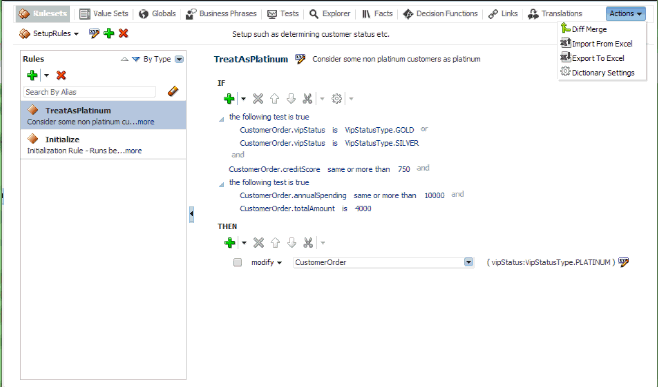 You should not confuse the Rules Editor with the Rules Dictionary Editor. The Rules Editor is used to edit rules inside a specified ruleset. In fact, the Rules Editor is embedded within the Rules Dictionary Editor. For more information about the Rules Dictionary Editor, see Introduction to the Oracle Business Rules Dictionary Editor Declarative Component.
