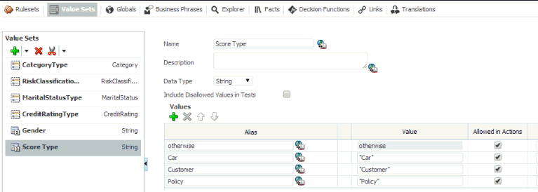 To support translation of aliases, the consumer of Rules Web UI application must pass an attribute to the Rules Dictionary DC or Rules DC. The attribute is resourceManager which accepts an instance of type oracle.bpel.rulesshareddc.model.interface.ResourceManagerInterface.java. However, this additional parameters are optional and required only if the consumers want to use the enhanced translation support.