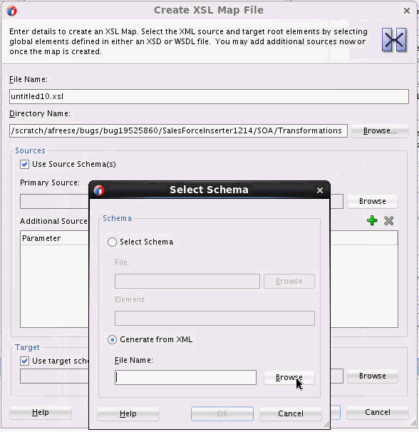 To create an XSLT map using sample source and target XML documents, select the Generate from XML option while selecting the schema for a source or target in a new XSL map.