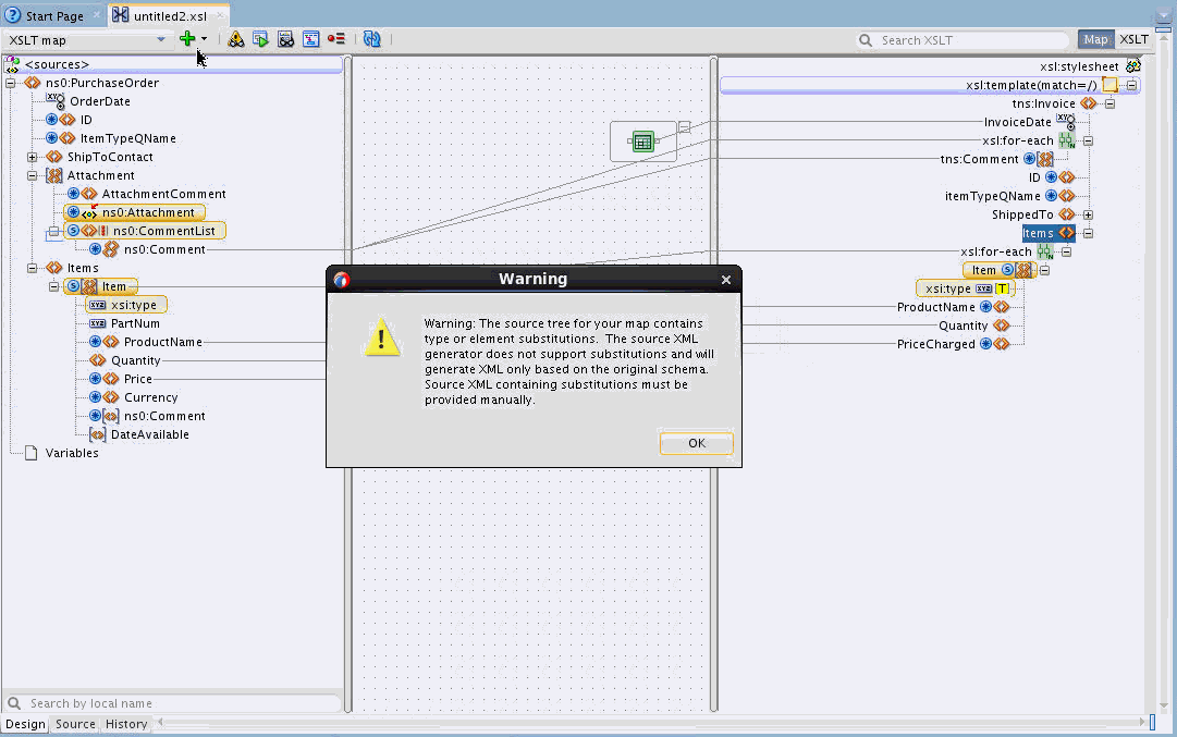 The test tool in the XSLT editor does not currently support generation of input XML documents that contain substituted elements. So, when you invoke an XSLT map where substitutions have been made in the source tree, the following warning occurs.