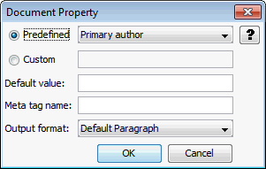This section of the Editor allows you to specify predefined and custom document properties to be placed in the head or body of the document.