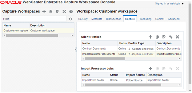 Capture users have access to the Capture client only. They can see and select only those client profiles to which they have been granted access. These end-users create batch-related content within a workspace, including batches, documents, attachments, and pages. Capture user information is covered in Oracle Fusion Middleware Using Oracle WebCenter Enterprise Capture. Workspace managers are typically assigned both the workspace manager and user role, which enables them to switch between configuring the workspace and testing configurations in the client.