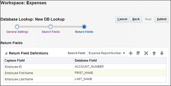 Figure 10-4 Configuring Database Lookup Return Fields for a Selected Search Field