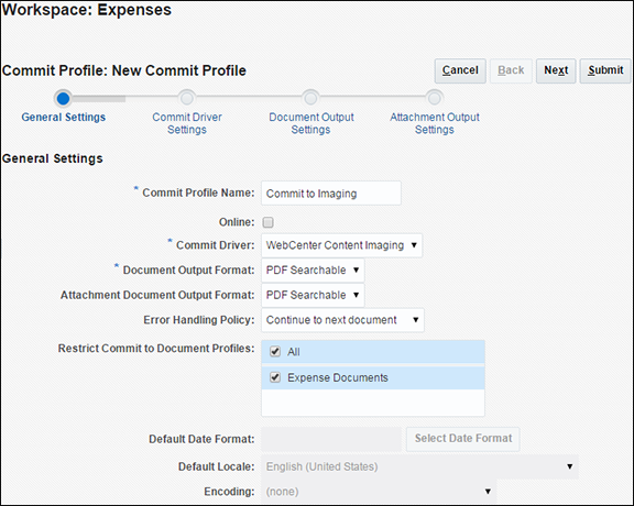 In this section, you configure commit processing. In a typical expenses scenario, expenses would be committed to Imaging for workflow processing. But for verification purposes or if you do not have an Imaging system available, you may want to configure a text file commit profile instead. You can configure one or both of the following profiles: