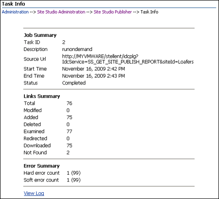 The Task Info screen is used to view information about the most recent task initiating the specified Oracle Site Studio Publisher crawl.