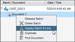 If an error occurs for a batch after you release it, such as during a post-processing step, the batch may display again in your batch pane, locked to you. (Note that a post-process may have renamed the batch.) You can right-click the document error icon and choose Display Batch Errors from the menu to view the error details.