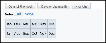 If all the months are selected, the publishing event will run every month. An asterisk (*) character is in the field in that case.
