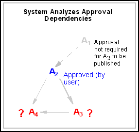 In Figure 17-10, the user marked asset A1 as Approved. However, the system treats the approval as tentative. Following a dependency analysis, the system determines that A1, even though approved, has an unsatisfied approval dependency on A2 and must be held from publication (until A2 is also approved).