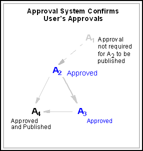 If the user had approved A2, the approval system would have determined only three approval dependencies (A2-to-A3, A2-to-A4, and A3-to-A4), even though the data model in our example specifies four dependencies.