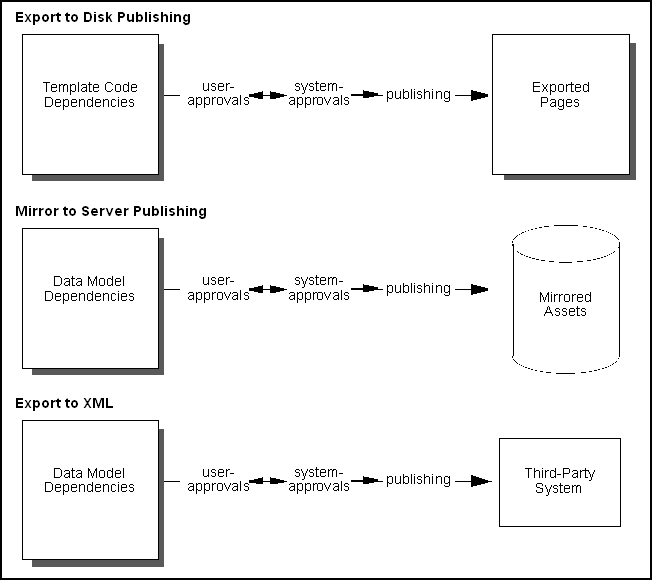Data model dependencies and template dependencies are created by the developer to specify how and which assets refer to each other for content; approval dependencies are created by users who approve assets. Approval dependencies are analyzed by the approval system and used to flag which user-approved assets can be released for publication and which must be held back from publication; which assets have yet to be approved by the user, which assets have been published, and so on.