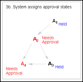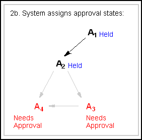 The system overrides the user's approval of A1 by assigning A1 the Held approval state. It assigns A2 the Needs Approval state.