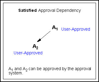 The preceding figure illustrates the system's approval of A1 as conditional on the user approving A2. A1 is said to have an approval dependency on A2. Because the approval dependency is unsatisfied, the approval system notifies the user.