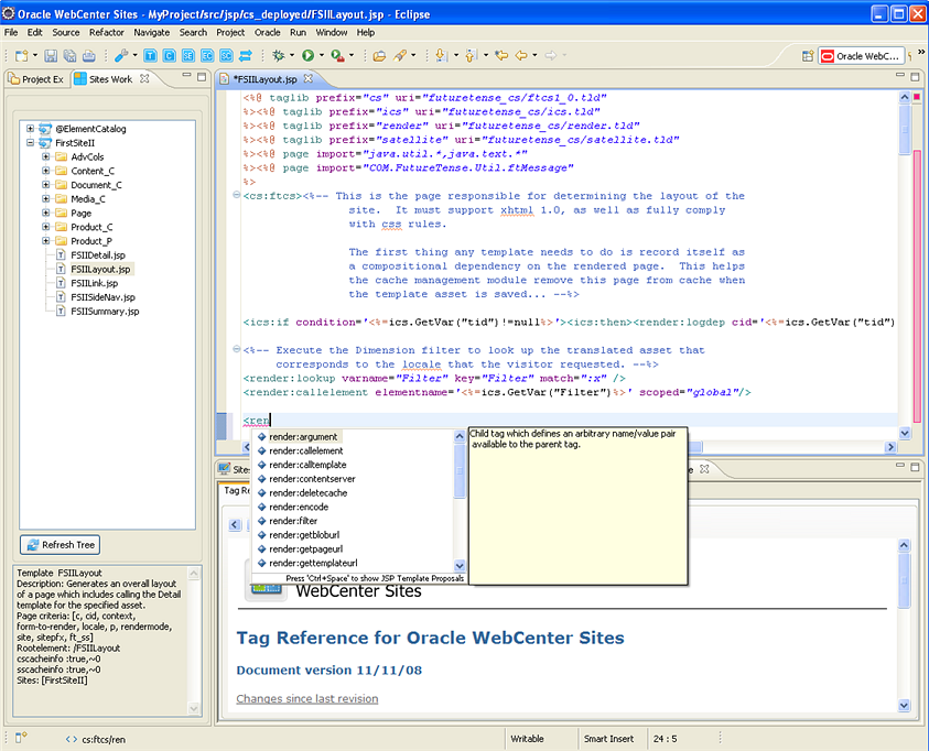 In Eclipse, the tag and Java API completion features display information about each tag and piece of Java code you use when managing a WebCenter Sites JSP. For example, when you are working with a WebCenter Sites JSP and you begin to type the name of a tag, a window opens listing code completion suggestions. Then, a second dialog opens containing information about each suggestion.