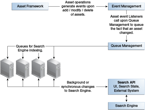 The search framework consists of the Search API, special asset event listeners, and a polling system for queues. You use this framework in coordination with the Event Management and Queue Management frameworks. This topic focuses primarily on the search framework.