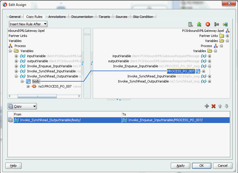 Drag the source node (CONFIRM_BOD_004) to connect to the target node (body) that you just identified. This creates a line that connects the source and target nodes. The copy rule is displayed in the From and To sections at the bottom of the Edit Assign dialog box.