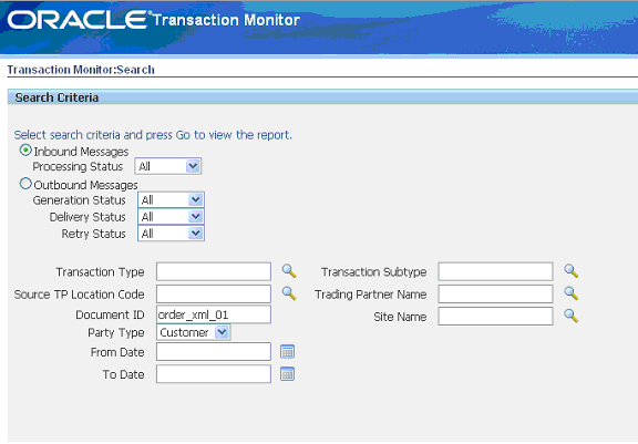 In Oracle E-Business Suite, you can check for outbound transactions that have been processed by the XML Gateway and delivered to the Transaction Agent by using the Transaction Monitor. You can also use the Transaction Monitor to resend an outbound document if necessary.