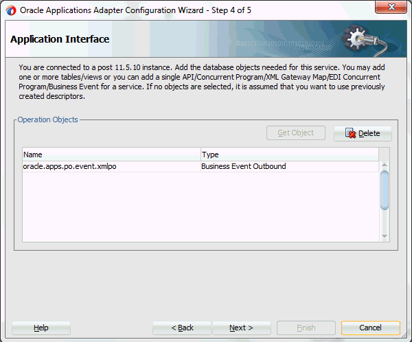To select a business event, expand the navigation tree to Product Families > Other Interfaces > Business Events > Outbound. The direction outbound is from the Oracle E-Business Suite perspective, in this case listening to business events from Oracle E-Business Suite. Select the appropriate business event, for example, oracle.apps.po.event.xmlpo, and click OK. The Application Interface page is displayed with selected business event.