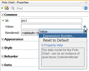 Automatic data binding: If your application uses the Fusion technology stack, then you can create automatically bound picto charts based on how your ADF Business Components are configured. For more information, see Creating Databound Picto Charts in Developing Fusion Web Applications with Oracle Application Development Framework.