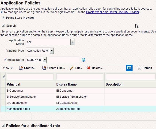 For more information about managing application policies and application roles, see Managing Policies with Fusion Middleware Controlin Securing Applications with Oracle Platform Security Services.