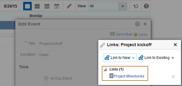 You can create a new event and add a link to it at the same time. For example, to schedule a meeting to address issues raised in a project, you can link the new event to the project issues list.