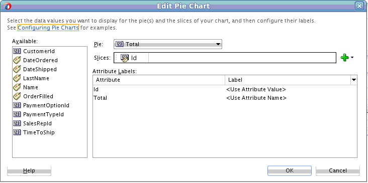 Creating databound UI components: You can create databound components by dragging objects from the Data Controls panel onto a page and selecting the UI component you want to generate to display the underlying data. Figure 2-3 shows a pie chart that has been created by dropping a collection as a pie chart on a page fragment in the Summit sample application for ADF Task Flows. You can bind existing UI components to the data model (or change generated bindings) using JDeveloper's binding editors. Figure 2-4 shows the binding editor for the same pie chart. In both cases, JDeveloper generates the binding code.
