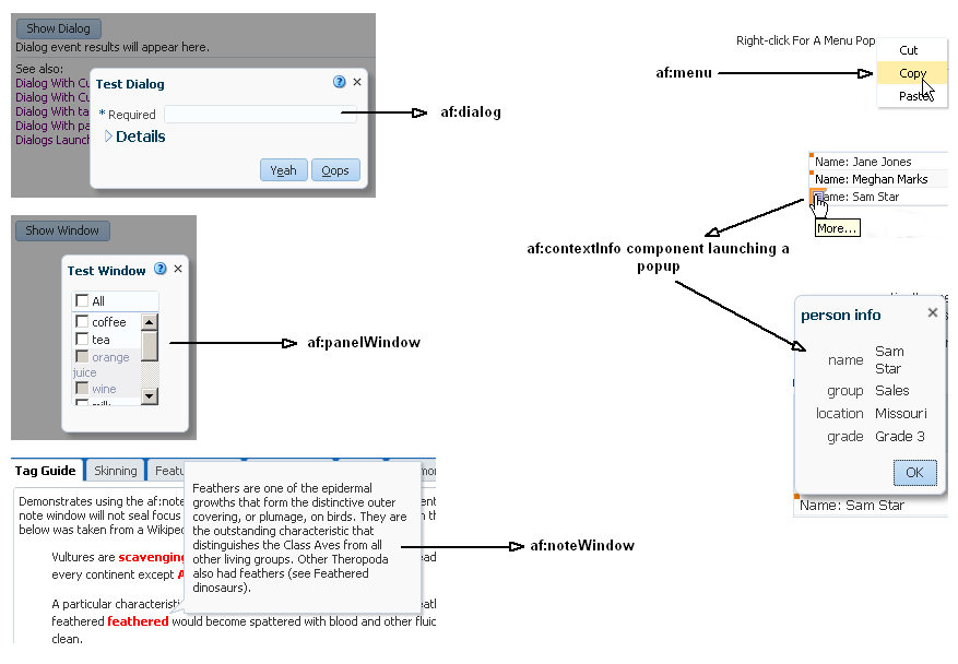 Figure 16-1 shows examples where the popup component works with other ADF Faces components to render secondary windows.