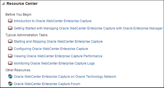 At any time while using the Oracle Enterprise Manager Fusion Middleware Control, you can use the links available in the Resource Center on the Capture home page to get help on typical system administrator tasks.