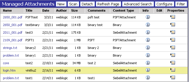 Use the Managed Attachments IFrame to view, attach, scan, detach, and edit Content Server documents attached to the selected Siebel record. You can also launch the Content Server application, and activate its search options to locate Content Server documents to which you have access.