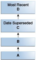 For example, a monthly report for April (A) will be superseded by a report in May (B) that is later superseded by a report in June (C), and so on. This figure shows A was superseded by B, which was superseded in turn by C, which was superseded by D. Item D is the most recent record. The date superseded is set on the previously active record, which in this scenario is item C. To step through an example of creating this type of relationship, see Superseded Link Example.